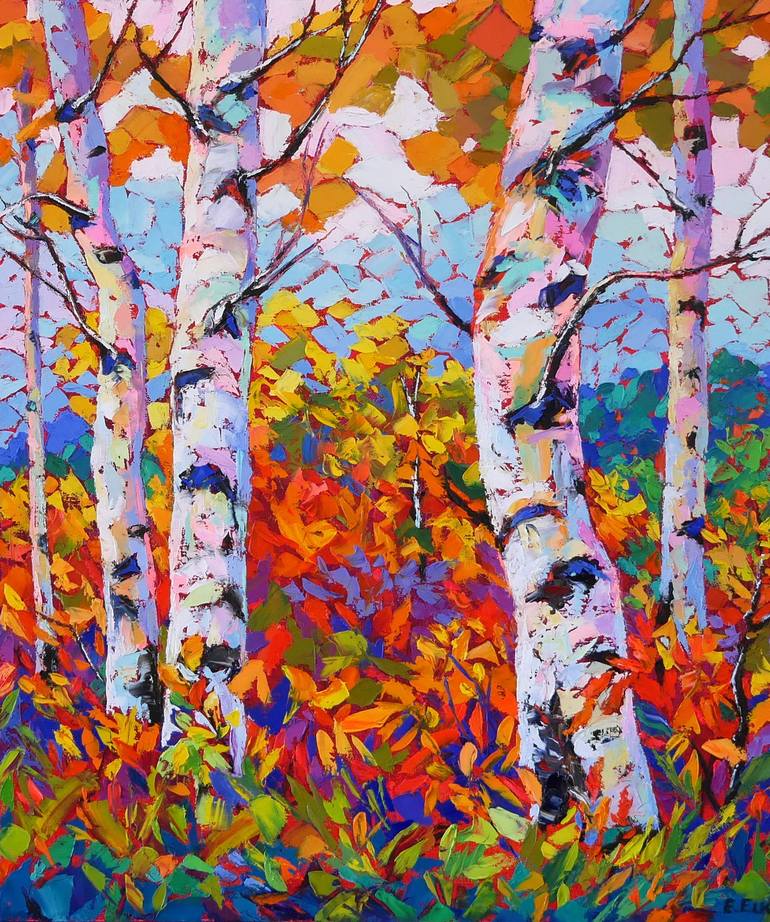 Artist: Elizabeth Elkin Work: Original Oil Painting, Handmade Artwork, One of a Kind Medium: oil on Canvas Style: Impressionism Size: 24"x 20" inch. Kaleidoscope Birches is a colorful depiction of a grove of birch trees. I'm using a kaleidoscope of colors, including crimson, orange, yellow, and gr...