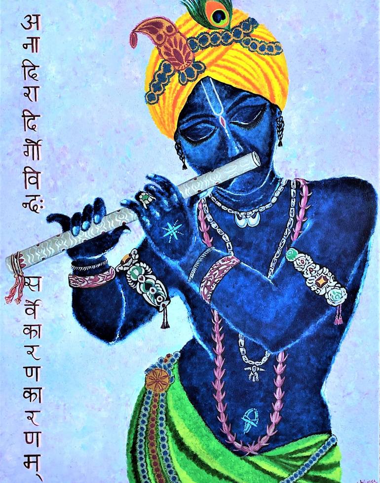 Kanha Kahna the Hindu God of protection, compassion, tenderness and love, is worshipped by Hindus as the eighth avatar of Lord Vishnu. This beautiful artwork depicts Lord Krishna, playing his symbolic flute. This unique artwork has been created in a different painting style. Specifically, the brush...
