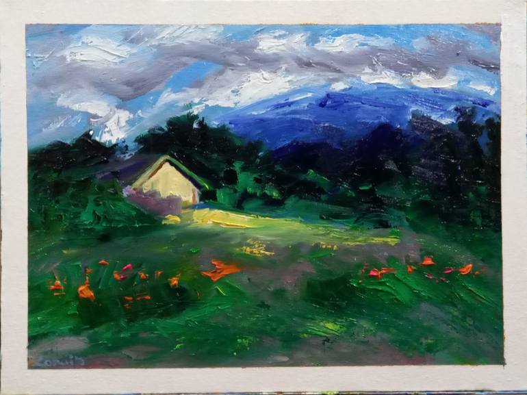 Kashmir Home , beautiful abstract landscape , painting with bright colors, made with oil painting with knife and brushes this work is on clean flat on stretched canvas , reflecting my love of landscape art in abstract way all artworks sent with a certificate of authenticity One-of-a-kind Original...