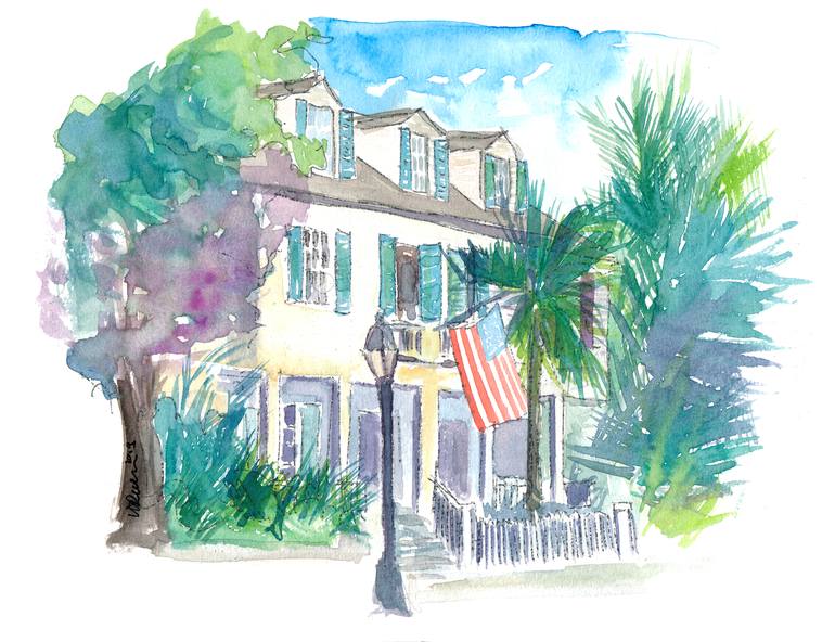Watercolor on Paper painting of Key West Conch Dream House - Sunset And Flag
