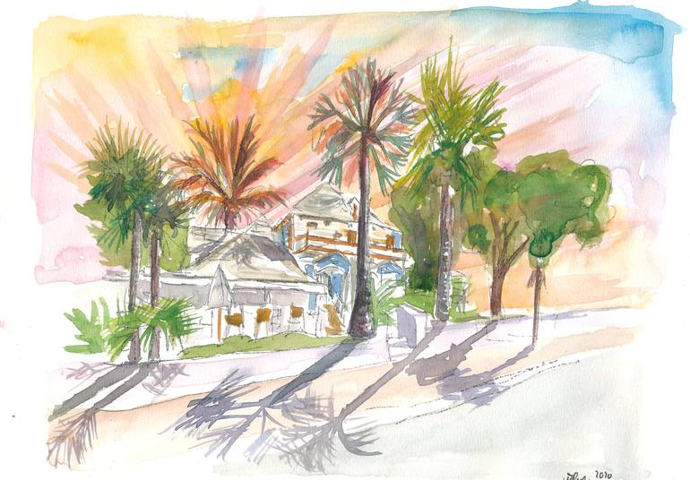Key West Duval Street Cafe under Palms and Sun Rays - Watercolor on Paper