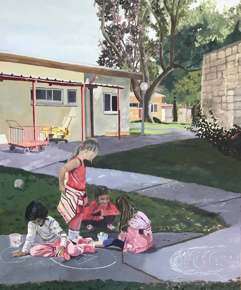 Living and working on the Kibbutz, I come across people and scenes that are enchanting. I take photos and then go to my studio (that can be seen in this painting) and paint them. Making them my own.
