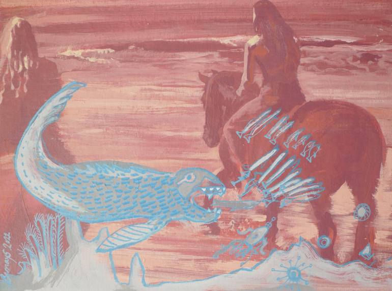 This time it is my sons sketch of a Dunkleosteus. The layering of realities in my experience as a parent. I paint to find my joy. It is my privilege of parenting, looking into his fertile imagination. I relish his world. It is again a memory. We did all go to the beach together, the horses and the...