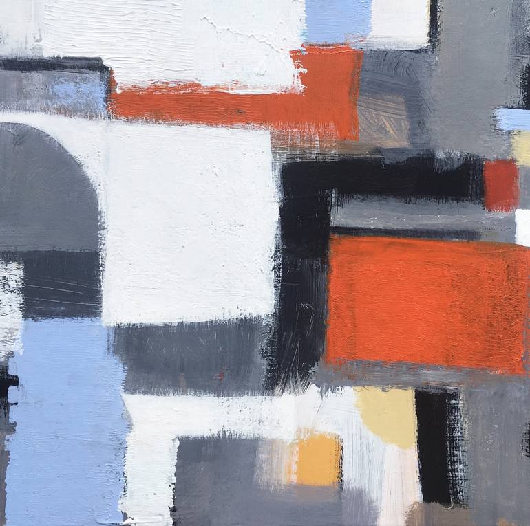 Original, expressive, abstract acrylic painting with grey, orange, black, blue and white, on loose canvas sheet, unframed.