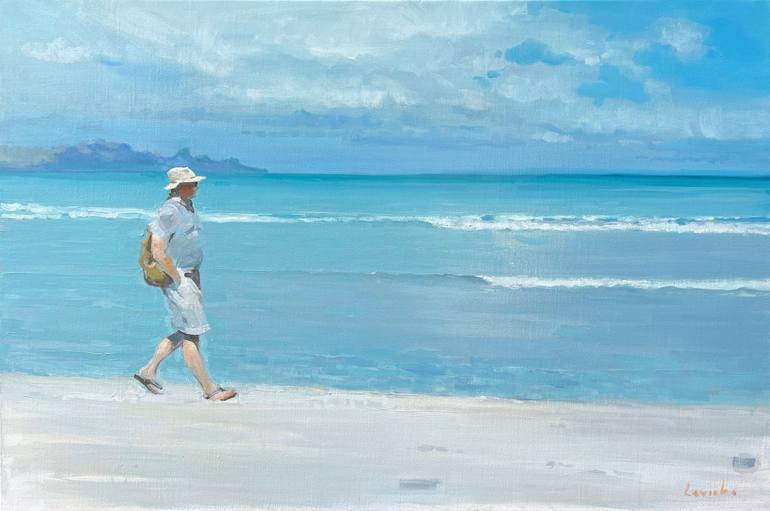 Presenting "King of the Beach," a captivating oil on canvas by Alexander Levich, created in 2024. This artwork beautifully captures a serene coastal scene, featuring a lone figure walking along the shoreline. The expansive seascape, painted in calming blues and soft whites, creates a tranquil atmosp...