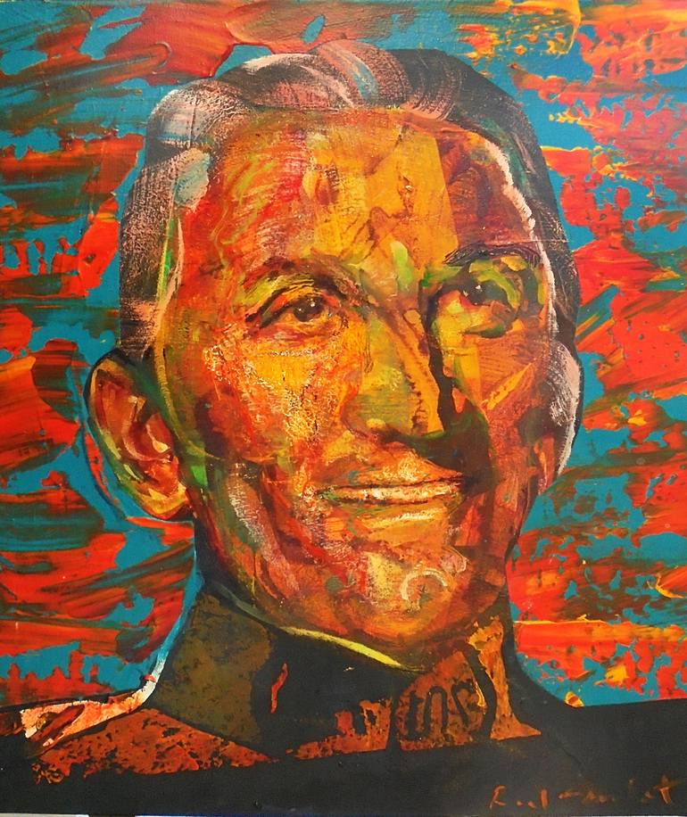 Rémi Jouandet is a painter working in Valence Drôme, France. For collectors he is one of the best kept secrets outside France and Canada. However, it is quickly changing, and it is all to do with his semi-abstract portraits. See in the not-too-distant past art critics felt uneasy about dealing with portraits of celebrities. Particularly, in the days when the novelty value of Warhol’s serial ‘Marylins’ wore out, and art had to shock, and teach us to abhore beauty. For the record, either one end of the polarised scale is justified by us — as is everything in-between. But then entered Elizabeth Peyton, a reputable, and formally trained artist who defied the prevailing dogma and championed the celebrities. Along with her exagerations came increasing focus on high-gloss cult images in the tabloid-media. Arguably, with Peyton’s and Jouandet’s work, there is a fine line between offering something kitsch, and adding some other dimension. Jouandet’s work falls into the latter category with the caleidoscopic feel he adds to each piece. The art has impact and is stripped of any sense of sentimentality. Rémi Jouandet is quite indifferent to what goes in an out of vogue with art critics. He caries on with timelessness as an ideal. We all alight a fashion train at some point in our lives. But sooner or later we decide to jump off at a station, and watch the train return ocassionally. Although he has many influences today, it turns out that an exhibition of Bacon’s work was a defining break-through for the way that the artist decided to approach art. There is method in the madness Often Jouandet works on two to three canvases simultaneaously. He prefers working in acrylics, and mainly because the paint dries quicker and helps him keep a speedy momentum. What’s quite characteristic for his art is his ability to work quite loosely to begin with, then follow on with more controlled and conscious strokes. Although he excels in drawing, he seldomly sketches, but works his way into the canvas until a few accidents lead the way. According to the artist himself, he begins with abstract painting. Then from the abstract expression emerges opportunities for beginning figurative work such as portraiture. The result is a vivid and contemporary experience, which does have some parallel to German expressionists for the vivid palette.