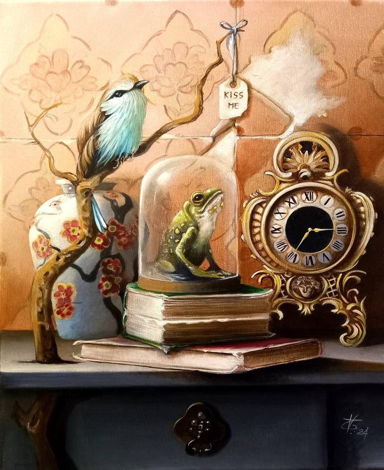 In creating this piece, I delved into the whimsical interplay of fantasy and time, inviting the viewer into a tender narrative of anticipation. Each element, rendered in vibrant acrylic, adds to the surreal clockwork of desire and transformation. The juxtaposition of the expectant frog under its cry...