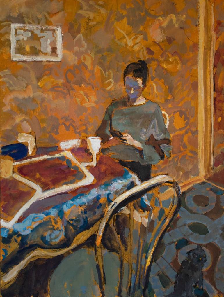 This painting captures a quiet, intimate moment at home. My wife sits at the table, absorbed in her phone, a cup of tea beside her. The warm, patterned wallpaper and the play of color create a sense of familiarity and nostalgia. The small black cat in the corner adds a quiet presence, observing the ...