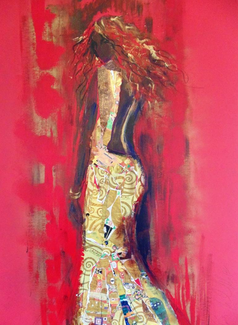 Klimt's Kiss Dress- Is a collage of Klimt's Kiss painting collaged on the painting. Gold and red the predominant colors. Klimt's Kiss Painting was inspired by the Byzantine mosaics he'd seen on his travels, Klimt mingled gold leaf into his oil paints to create what would become his signature style....