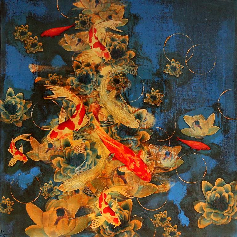 A delicate flow of beautiful Koi fish through water lilies. In Japan, Koi fish are traditionally symbolic of prosperity and good fortune. Set to a background of cobalt blue and burnt umber, with a warm pop of vermilion from the Koi. Ink washes and a varnish finish add texture and depth. The color p...