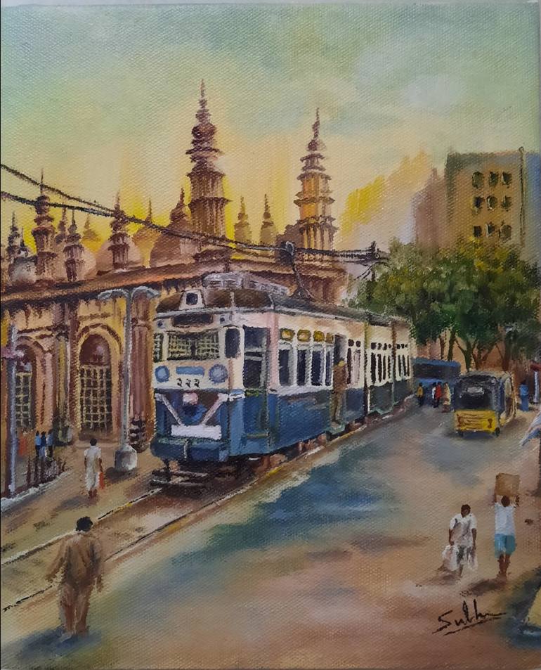 An oil painting depicting Kolkata city. Trams are still operative in this beautiful bustling capital of West Bengal in India.