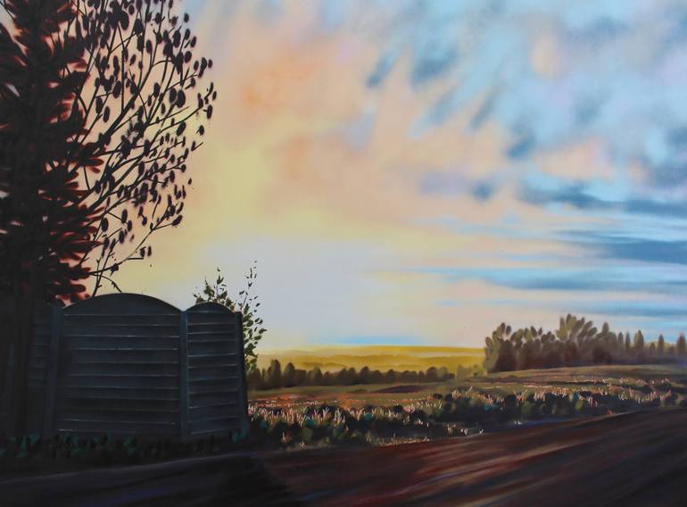 Sunset in germany looking over a muddy corn field. Spray paint landscape