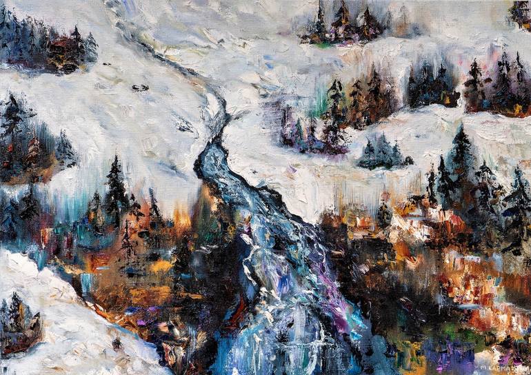 If you perceive the picture through the prism of the Ukrainian female name Kora, then it loses its framework and becomes infinite. Original painting created by Ukrainian artist Marharyta Karmazina. Unique art. The idea of the picture is taken from a photo of mountain landscapes from open sources...