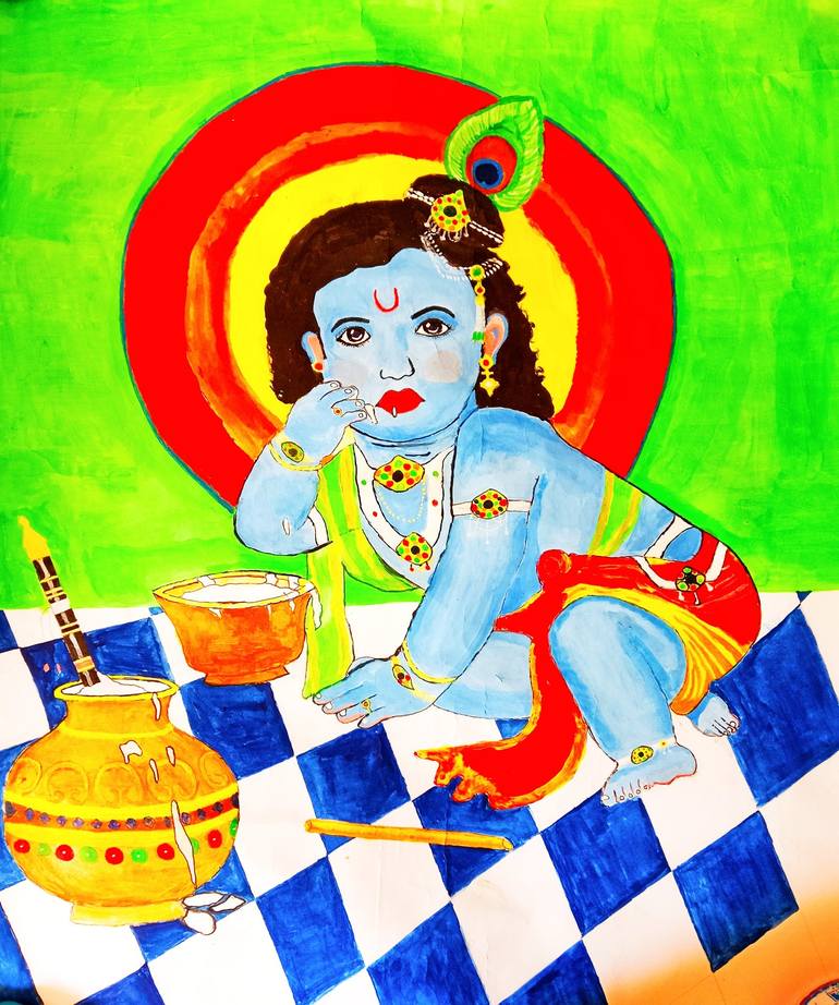 Krishma Acrylic Painting, Makhan chor krishna painting Print