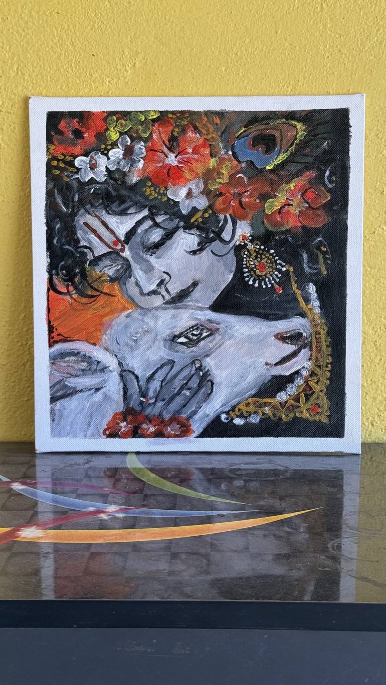 This painting represents the affection toward their devotee’s, and surrendered devotee of Krishna. I used acrylic paint on 10/12 canvas board for this painting .