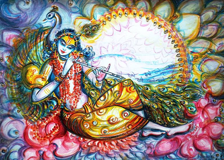 I created this Radha Krishna Painting in Water Color and enhanced it with Crystals. I imagined Krishna playing Flue for Radha and the whole Cosmos is involved in Love and Music. Please contact for Original Paintings. If You have any questions, my contact info is Thanks for stopping by