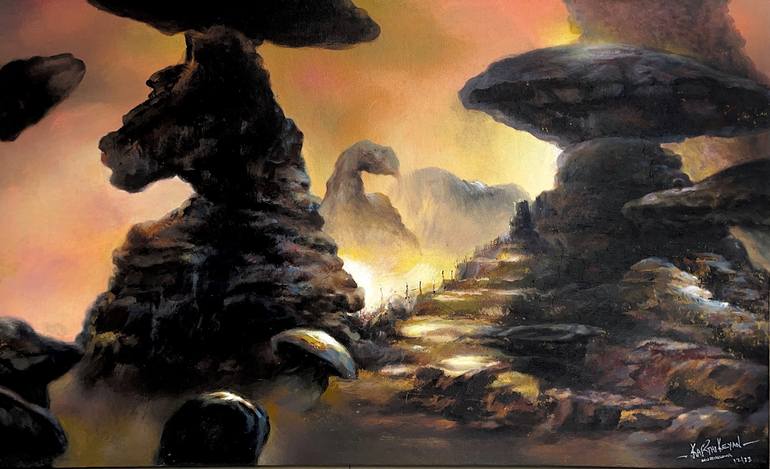 Karthikeyan Muringoor’s painting, inspired by Kudakkallu (umbrella stones), offers a surreal interpretation of these ancient megaliths. The dark, towering stones in a dreamlike landscape evoke mystery and timelessness, with warm light in the background contrasting their cold, rigid forms. The glowin...