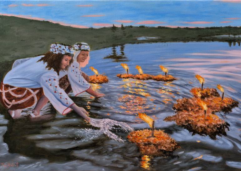 Kupala night, also called Ivan-Kupala,or just Kupalo is a traditional Slavic holiday that was originally celebrated on the shortest night of the year. It represents a pagan fertility rite. Original artwork. Stretched on wooden bars, ready to hang.