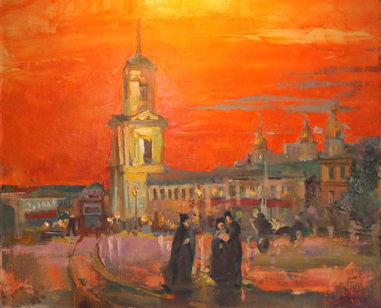 The painting of Kontraktova Square in Kyiv with a bright red sky creating a dramatic atmosphere. In the foreground, monks near the church emphasize the spiritual and historical essence of this iconic place. The art conveys the beauty and depth of Ukraine's cultural heritage. The painting needs a fr...