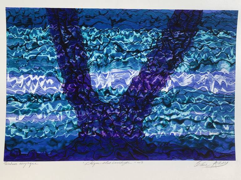 Blue and violet sea with purple seaweed form. This painting is related to my Sastrugi (oil on canvas) and Pelagic (acrylic on paper) series. The inspiration comes from noticing items washed up on the beach and the image of swaying kelp while snorkeling off the Dorset coast.