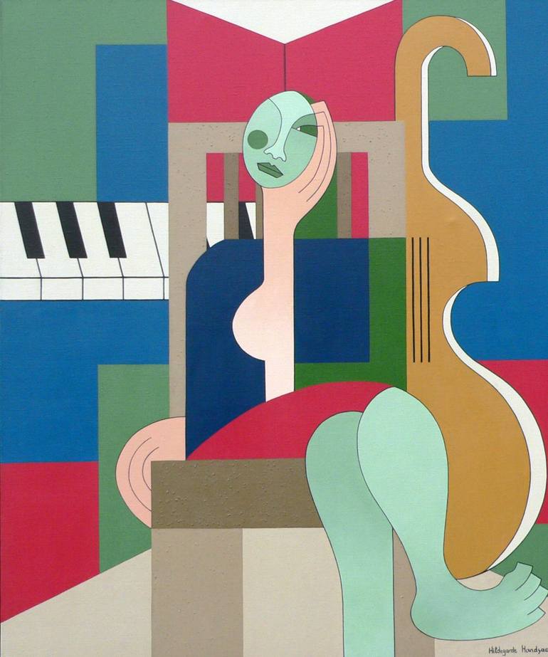 This artwork is a compelling example of modern abstract art, blending geometric forms with a vibrant color palette. Dominated by bold shapes and intersecting lines, the composition creates a sense of dynamic movement and balance. The focal point appears to be a stylized figure, whose body is divided...