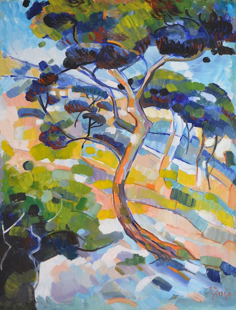 C'est un damier de couleur que propose cette nature formée de rochers et de résineux typique des forets provençales. Toile faite de mémoire en atelier. . ...