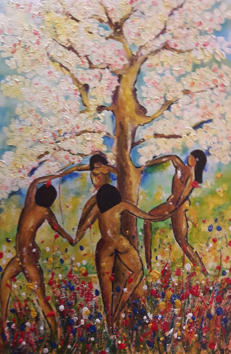 Représentation d'une Joyeuse scène de vie célébrant "la joie de vivre" avec des personnages stylisés se donnant la main et dansant autour d'un arbre fleuri et plein d'espoir ! Bonheur, Gaieté, Liberté ! L'artiste a ajouté des jets de peintures représentant des éclats de fleurs dansant avec les perso...