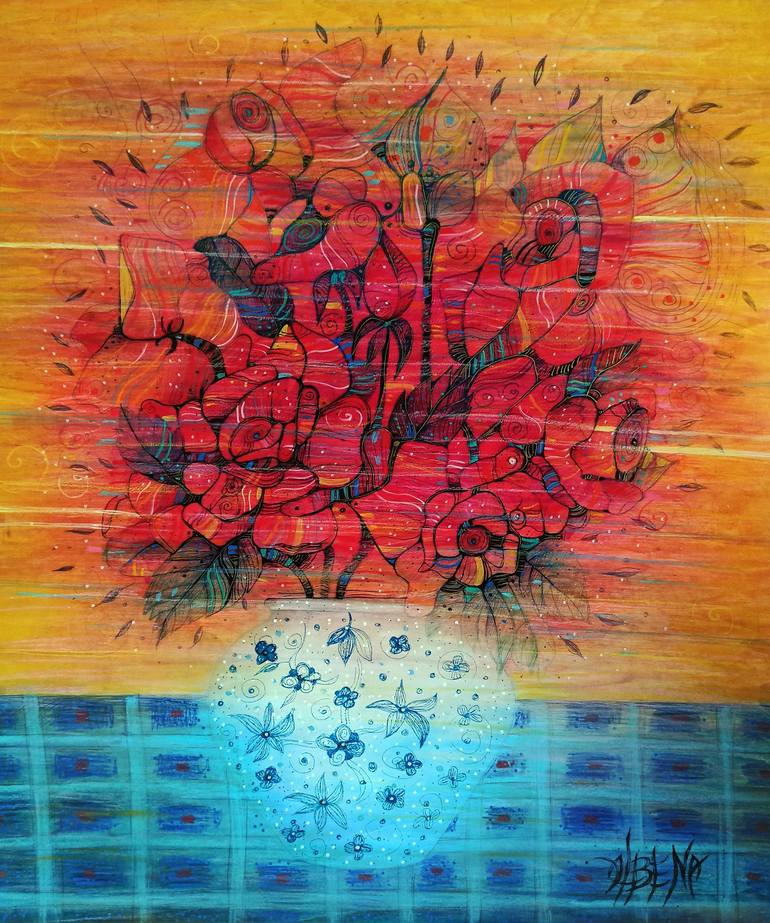 This is a work painted in oil on wood with several successive layers, oil pastels, outlines in black Indian ink. Effects with gold metallic oil paint. Touch-up varnish. My work is all about capturing love, tenderness and beauty in life. My favorite media is oil. I have worked a lot to create my ow...