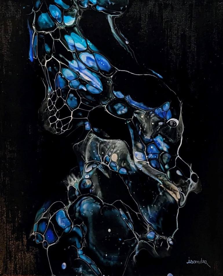 Pretty cells in this face in profile, with phthalo blue, turquoise blue, touches of metallic white, white lacing on a black background. Glossy varnish finish. Sold without frame with its hanging system.