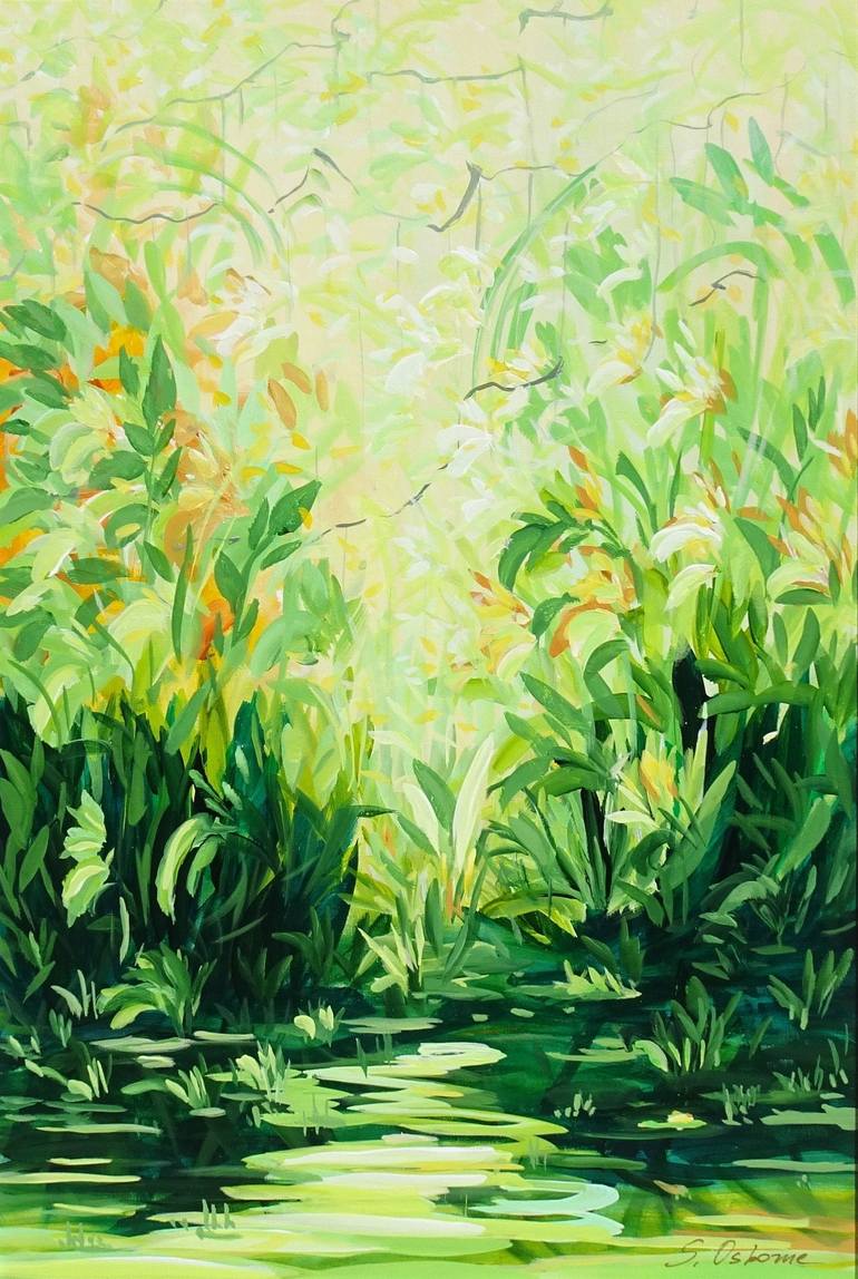 Semi-abstract and expressive landscape painting. Beautiful calming piece that will compliment any home or office. I was inspired by Impressionism, Claude Monet's Waterlilies, Giverny, and my Florida tropical garden. About the process: This piece was started with no preconceived notion of how the pa...