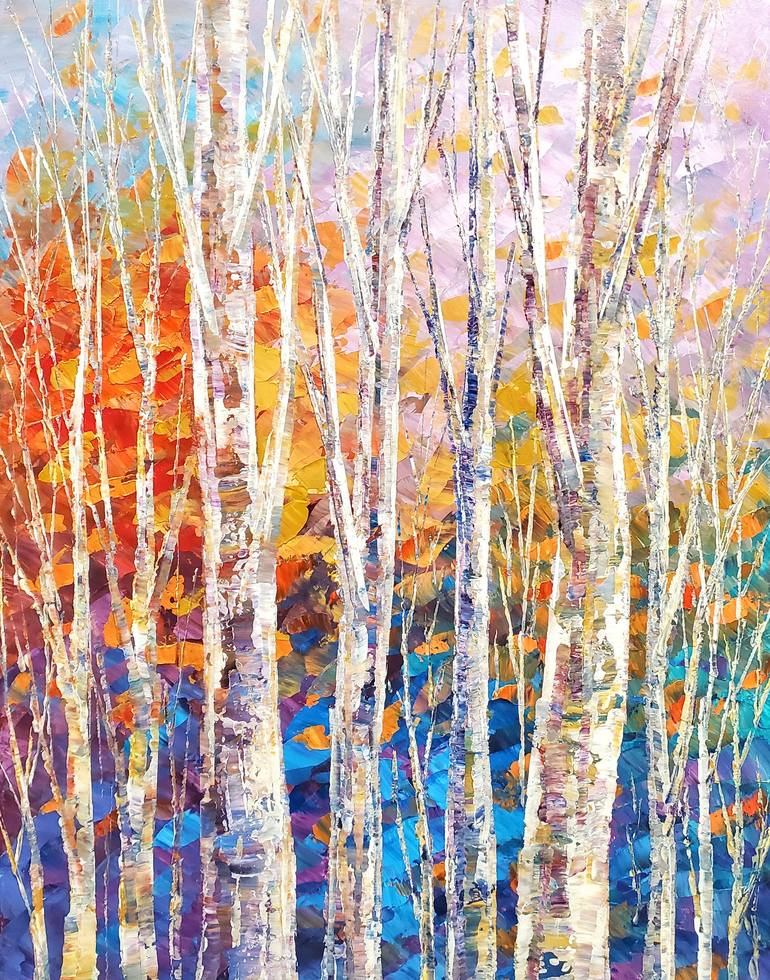 Sunlight dances through the trees, illuminating fleeting moments. This is an original palette knife forest painting. Size: 22" x 28" x 1" Sides of the canvas are painted grey. You will receive it "ready to hang", with a wire attached on the back. Protective coat of satin varnish applied. The painti...