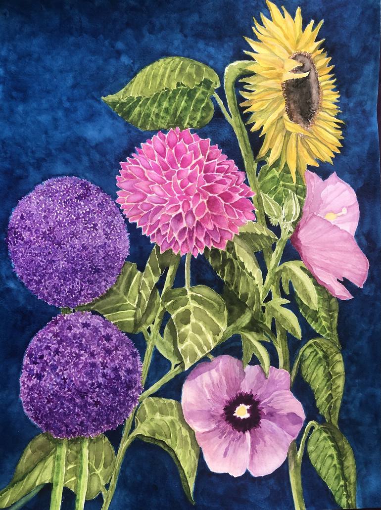 This is the first watercolor painting I’ve ever made. I decided to explore watercolor as a medium, during the early Covid lockdown, and decided to paint this using different photos of flowers that I photographed around NYC. I combined them in this composition for aesthetic appeal.