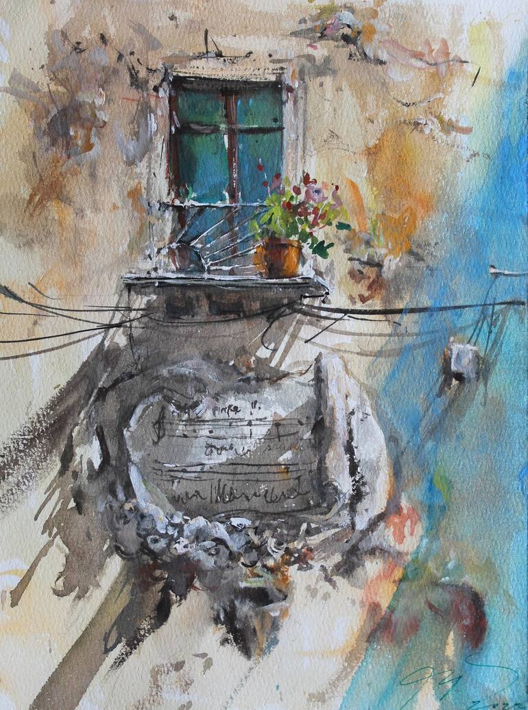Original Watercolor on Paper 11 H x 8.2 W ( 29 x 21 cm ) This painting was made on location in the summer 2021, in Naples ( Italy)...it depicts a well known Window, where legend tells that the Neapolitan poet and writer S. Di Giacomo, seeing a small window on whose sill there was a carnation, had th...