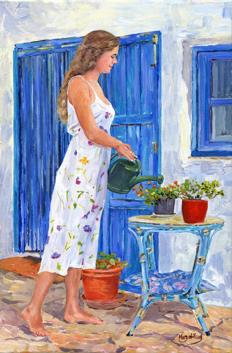 La Jardinera - The Gardener. Francesca in my neighbour, Ute's garden again but this time I have painted her in acrylics to capture the vibrant colours of this composition. I love the setting of the tall, graceful girl on the terrace of a rustic Andalusian, cottage Medium - Acrylic on canvas