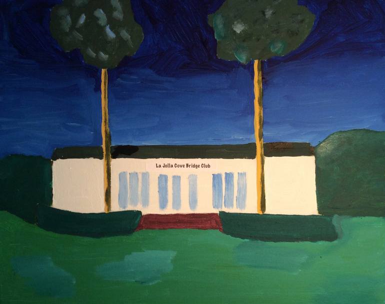 I painted this after a winter visit to La Jolla, San Diego. The wooden building just seemed to float in a green garden area next to the sea. The canvas is stretched on a wooden frame with ring plates and cord, ready for hanging.