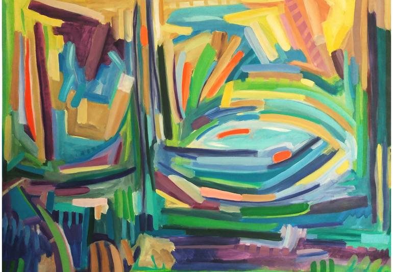 La Mare 29.1x 43 inches 74 H x110 W cm At the end of the corridor is painted with Acrylic paint, Inktense and Caran d'Ache pastel, on a cotton Edition Canson paper 320g primed with gesso, it is varnished with UV protection satin varnish signed on the front, and will be delivered with a certificate o...