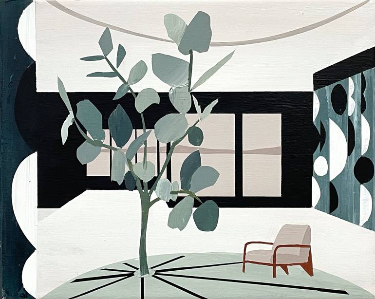 I create a paradise in each painting, with modernist architecture and its utopian ideas and sublime, lush nature. Together, architecture and nature become a new oasis, they merge and are reflected in each other. The open architecture gives space to nature and plants and trees invite contemplation an...