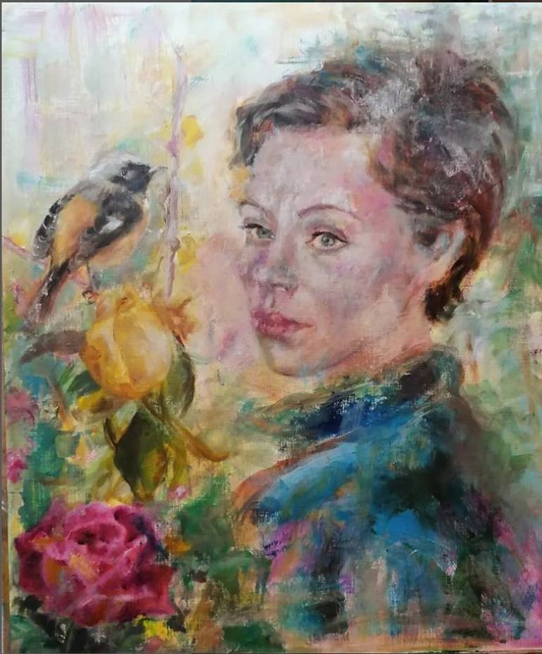 "La dama de las rosas" looks at you from the mystical rose garden of the soul. Painted on paper in oil.