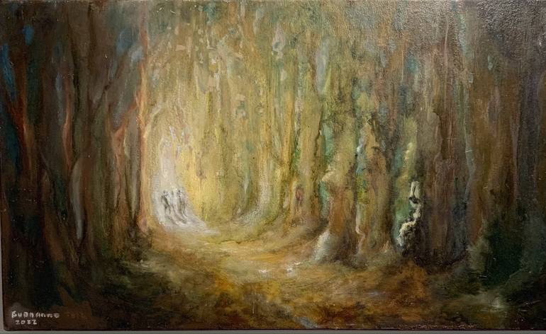 This work is inspired by the tales and legends of the Middle Ages. The painter is very fond of fables and epics. She retraces here a moment with imaginary characters bathed in light in the undergrowth. The scenery is quite mysterious.