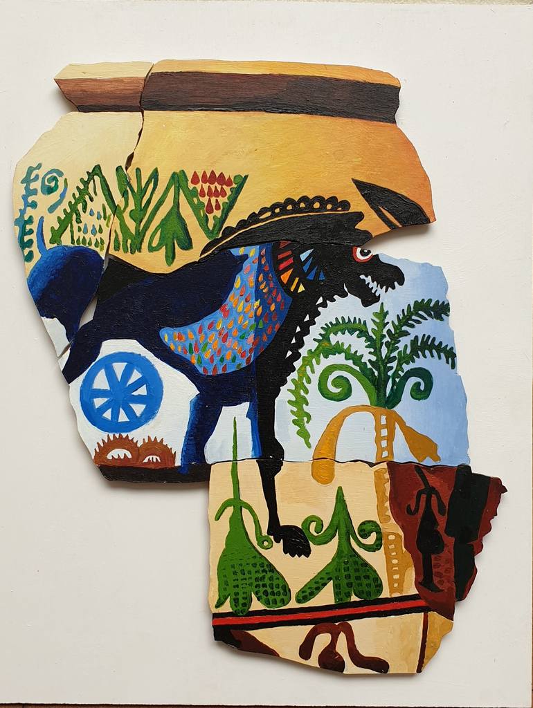 Inspirado en los dibujos de las vasijas de la Edad de Bronce de los iberos ( España ) Pintado sobre MDF a modo de puzzle reconstruyendo el original . Las medidas exacts son 40 x 51 cm