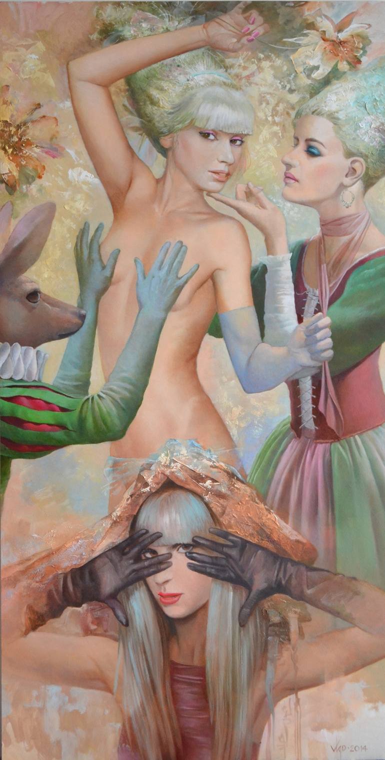 Artist Vlad Tasoff is a master at blending the worlds of the fantastical and the real to create dynamic paintings that celebrate the essence of human spirit. His works offer a unique brand of organic surrealism charged with delicate intimations, traces and shadows. Overlapping, semi-translucent veils of rich, frosted pastel figuration sketch out the female body in synthesis with the vegetal and geographic features of mysterious terrain. Adopting the characteristically surrealist trope of masquerade as metaphor, Tasoff’ s dynamic use of hybrid female forms greet the viewer during precious instants of sensual slumber and spiritual discovery. Specific archetypes such as angels, enchantress and deities appear to fise seamlessly into their surroundings. Tropical oases, glacial slopes and dewy meadows emerge amidst illusions to Western and Oriental culture, fashioning mystical landscapes ripe with the beguiling fruit of forms, symbols and signs…