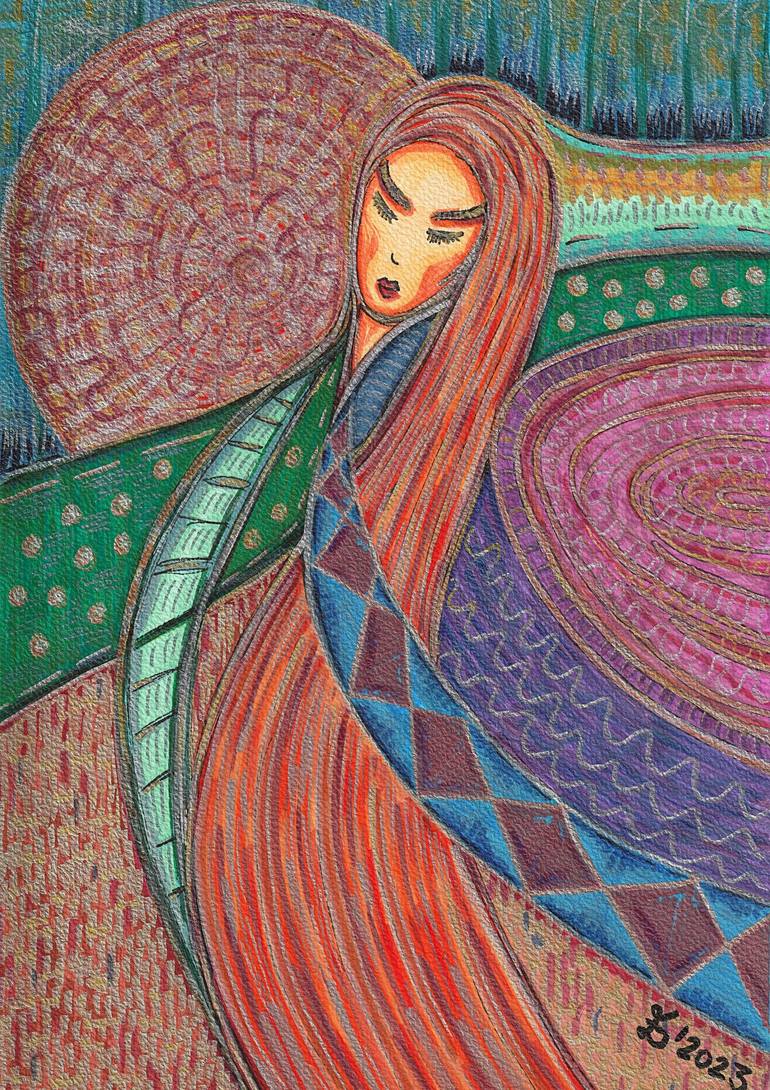 Lady Midday. Fine art painting by Ewa Dura. Markers on paper 300 g/m2, size A4 (21 x 29,7 cm). Artistic color painting. Metallic effect. The painting is sold with a certificate of authenticity - signed and dated by the Author. Please note! The artwork will be delivered unframed. The artwork is ...