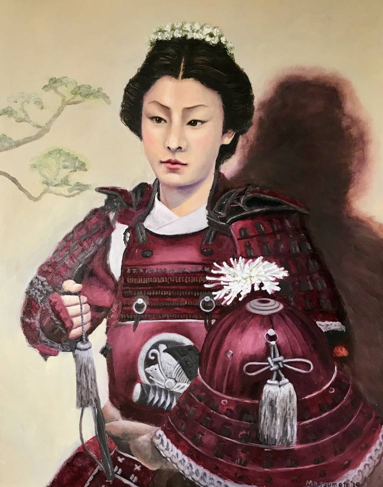 Based on an old photograph of a young Japanese woman dressed in samurai armor. Her youth and innocence contrast with the heavy armor and helmet for the fight. A single chrysanthemum flower adds to her femininity. This is part of my Goddesses and Warriors show, in which I celebrated beauty, strength,...