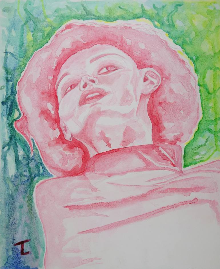 The inspiration was a photo from "Vogue" magazine. Especially her sigh, which was so powerful. The photo was black and white, but I saw it in color but the red was more adequate for the powerful woman. Water is an element strongly connected with a woman's energy. That is why I painted that portrait ...