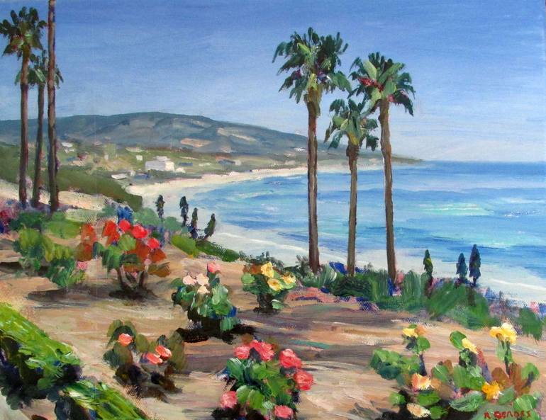 On a bluff above the crescent-shaped Laguna beach, a rose garden grows along the walkway. Palm trees mark the edge of Heisler Park, a popular location for folks to gather. Laguna Beach is on the southern California coast between San Diego and LA. The technque includes pallette knife work in additi...