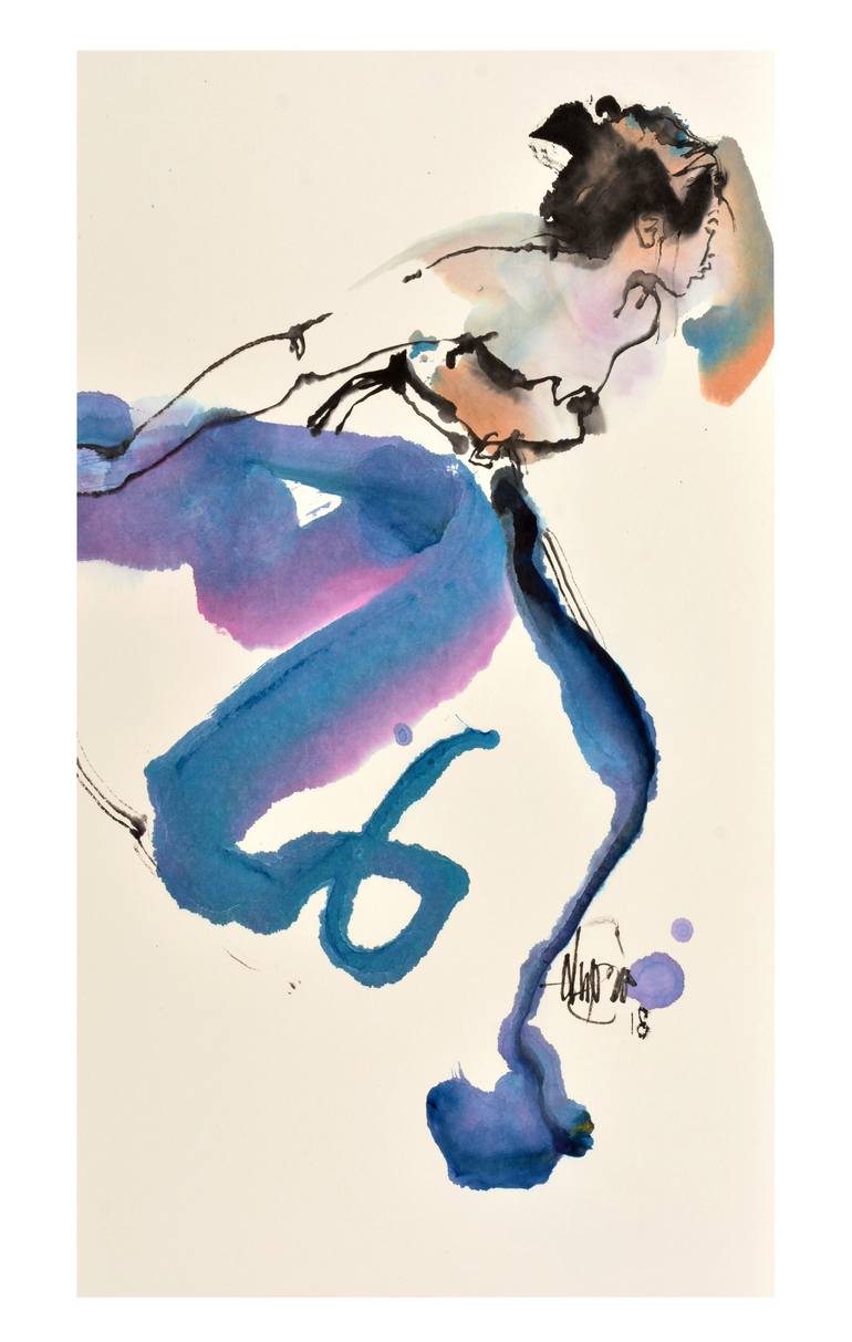 I wanted to catch the movement when Laiyan, a chinese girl, was dancing. I tried to paint her with only a few brushstrokes and some ink staines. You can feel her energy. I made the painting on yuan paper which I later mounted on Hahnemuhle paper. The work has a passepartout and need a frame.