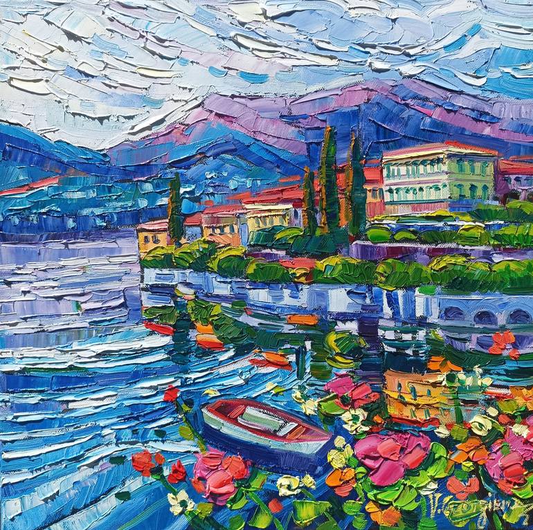 Beautiful landscape of Lake Como, original oil on high quality linen. One of the most beautiful and charming places in Italy... As always, VANYA's interpretation is majestic, lively, colorful with the effect of excellence! Each work by Vanya is accompanied by an original gift (watercolour, bookend o...