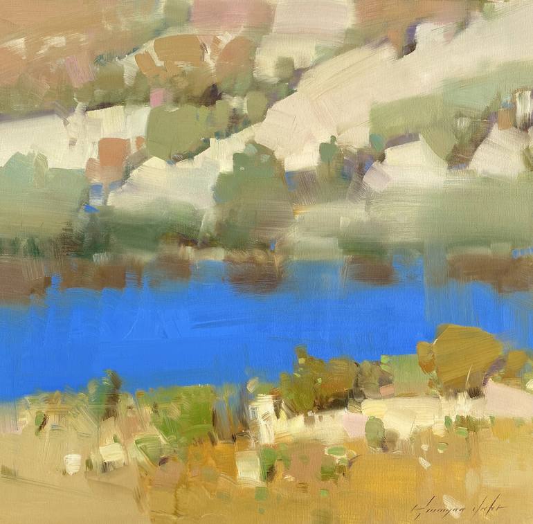 Artist: Vahe Yeremyan Work: Original Oil Painting, Handmade Artwork, One of a Kind Medium: Oil on Canvas Year: 2021 Style: Impressionism, Subject: Lake Side, Size: 19" x 18.5" x 0.8'' inch, 49x48x2 cm, Unframed, Stretched on Wooden Bar, Gallery Wrapped, Ready to Hang. Yeremyan is an Armenian...