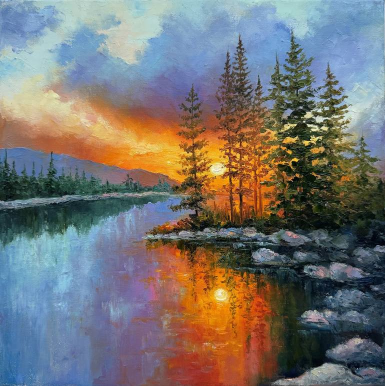 100% original hand painted fine art one of a kind by Alla Kizimenko. The lake Tahoe painting is painted on stretched canvas with artistic oil paints. In the work I use only high quality material. The size of the work is 12 x 12 inches (30 x 30 cm). The painting with the beautiful California mountai...