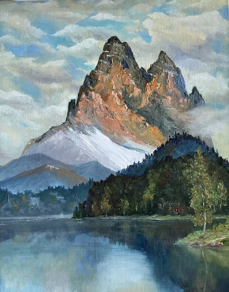 Lake in Mountains Landscape Original painting in Oil made by master-class but by its palette gamma and a different strokes is one-of-a-kind artwork. The painting was done on a canvas board 28x36cm (11x14") with a high quality professional paints by brushes and a palette knife. Lake in Mountains Lan...